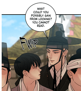 How could the lord be so sure that Baek Na-Kyum was illiterate? He never saw the young painter reading and in the chapter 6, Jung In-Hun even exclaimed that he was the one who taught the low-born how to write and read in order to highlight his competences.
