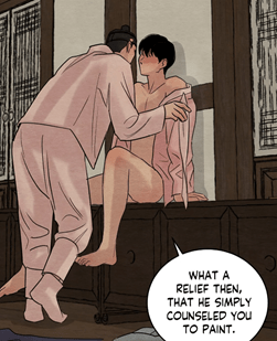 This explains why Jihwa and Min decided to have the painter killed. As a conclusion, the lord created a fake image of himself as a powerful and self-assured noble with a strong stamina which no one ever questioned. All this underlines how big his fear is to reveal his vulnerability and sensitivity. His strong stamina was the result of drinking a lot of replenishing medicine (aphrodisiacs), no one has been really suspecting that he was no homosexual right from the start, even the readers were fooled by Byeonduck. The lord is a master of deception hence he could only fall for someone who symbolizes the opposite: naturalness and unrestraint. You all know the saying: opposite attracts.