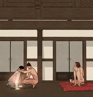 By contrasting both images, the beholder detect the difference in the distance. It was as if Seungho had got closer to Baek Na-Kyum. However, we have to imagine that this is just an impression due to the perspective. Nonetheless it reflects their increasing closeness. Little by little, the noble is definitely getting closer with his seduction but just virtually. We have to remember that each sexual gesture is addressed to the young painter. The climax of their developing intimacy represents the following picture.