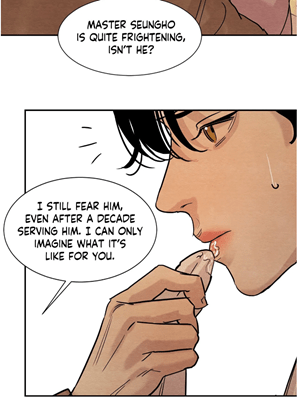 In the manhwa, the adoptive parent is valet Kim. He is the one taking care of Yoon Seungho. He helps him getting dressed and even brushes his hair. We could say that he sometimes acts like a mother (brushing the hair) or like a father (asking the doctor for an aphrodisiac for the painter). However, due to his social status, he is not allowed to be considered as Yoon Seungho’s father which explains why the aristocrat has to remind him of his place.