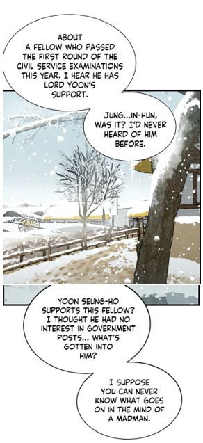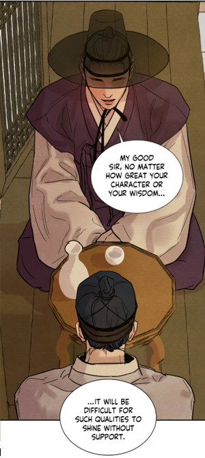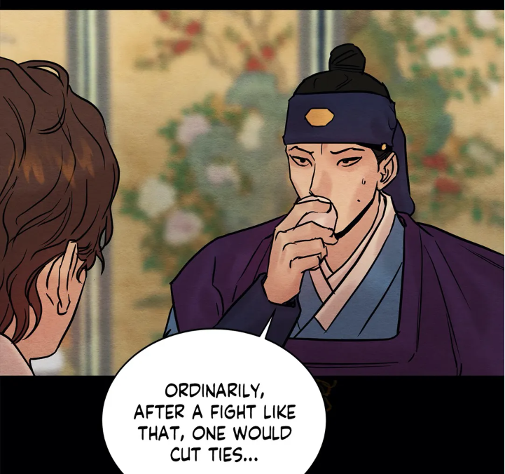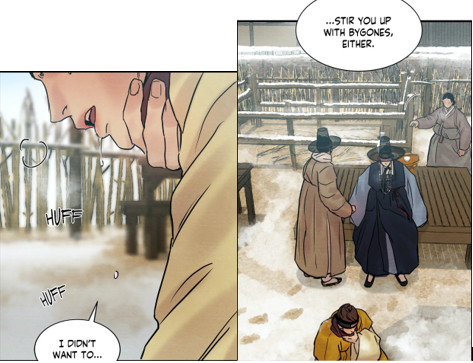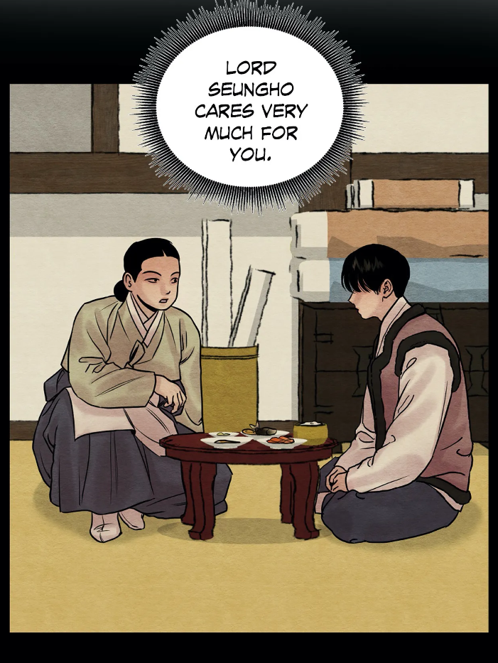 He doesn’t care about his lord or the painter, for only his interests matter. Since Kim has been following his master for a long time, he is well aware that the former is suffering and still living in the past. Striking is that when the butler portrays his lord to the painter in chapter 12, he talks about Yoon Seungho’s past and present: