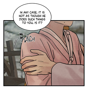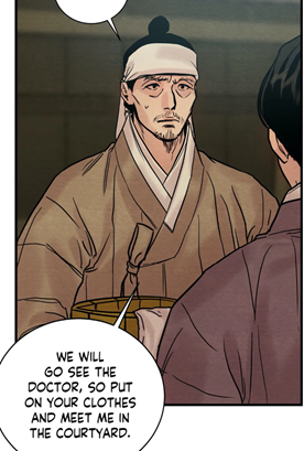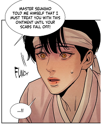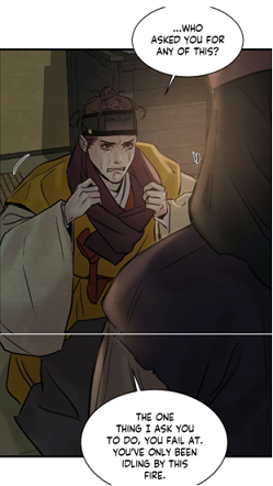 Note the painter’s reaction. He is scared, because the treatment with the ointment is presented like a threat and an order. The reality is that Yoon Seungho showed great care by sending his own valet, but due to the valet’s expressions, the lord appears more overbearing and threatening. That’s why I come to the conclusion that Kim is instilling fear in the painter, and if you pay attention to the protagonist’s attitude later, you’ll notice that he is indeed afraid.