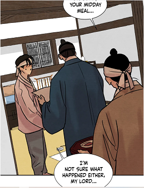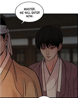 • In chapter 50, the manhwaworms viewed him on the threshold of the scholar’s room. Here, the artist was not present, but he was the main topic of the discussion. What caught my attention is that the door was wide open, yet the lord was standing far away from the door. The readers didn’t even see him opening the door. Furthermore Kim’s position changed gradually, because he came closer to his lord and even entered the room. And the switch of position reflected his change of attitude. In the last picture, he was giving his lord an advice. He was no longer acting as the submissive and obedient servant, but as his advisor, which annoyed Yoon Seungho. Hence the lord has to remind him of his true position: he is just a domestic and not an advisor, a place reserved to a noble. But despite his scolding, the noble did listen to his “loyal butler”. With his words, he persuaded his master to keep his distance from the artist. Out of pity, the noble should resign. And now you comprehend why the noble had a relapse after this conversation. The butler was able to keep him in his cage. That’s why we never see him leave the room, a symbol for his cage. And this interpretation reinforces my theory that Kim was indeed responsible for Yoon Seungho’s Stockholm Syndrome. The chapter 50 truly showed that despite his social position, the butler saw himself superior to his master. He was not just the lord’s right-hand, but his heart and his mind. He got closer to his master and even gave his opinion, though he had not been asked. He had in reality usurped his position. To sum up, behind his submissive attitude, he behaved the exact opposite.