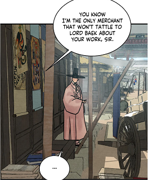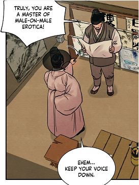 What caught my attention are the drops of sweat on both characters. Back then, I thought, like many readers, that the origin of the discomfort was related to the unusual order: the tailor was supposed to make expensive clothes for a low-born. However, since we know that the tailor recognized Baek Na-Kyum as the painter working under a pseudonym, I believe that they were awkward for a different reason. They had to act, as if they didn’t know each other. This explains why the drop of sweat appears on both faces