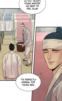 However, let’s not forget that the servant has a real reason for his silence and his faked ignorance. He will get glasses, which he truly desires, therefore he can’t tattle this to lord Baek. On the surface, Jung In-Hun hates sodomy, nonetheless he benefits from it through the master’s paintings, exactly like in the original story. As you can imagine, I saw a new evidence for my theory that Kim is actually Yoon Seungho’s enemy, the surrogate father who betrayed and abandoned the aristocrat due to his selfishness. First, the servant has a similar mentality: silence and ignorance. Besides, observe that in the second special chapter, the domestic plays the role of the “adoptive” father, the one who is caring and giving some comfort.
