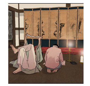 (chapter 36). And remember that this chapter is a new version of chapter 36. In that episode, the valet was the one who brought the artist to the lord’s chamber. Moreover, the way the door is shut clearly exposes a certain violence.