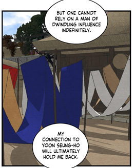 (Chapter 56) He knew that this would hurt the noble, yet note that he felt no remorse and blamed his childhood friend. However, like I pointed out, he was impersonating a person. If asked, the childhood friend would have used a similar excuse. That’s why Yoon Seungho answers in a quite similar way: he calls him “lord song”. However, he pushes him.