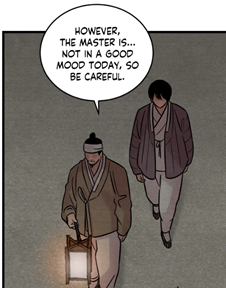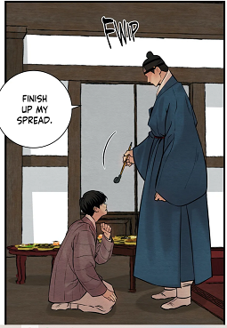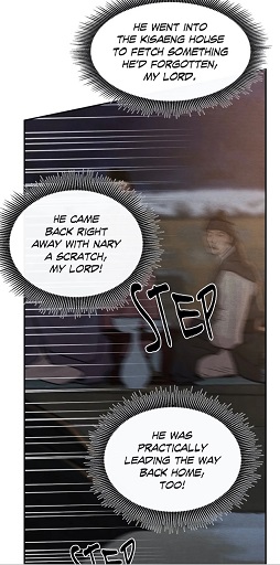 (chapter 22) Since Yoon Seungho perceives himself as cultured, because he reads so much, he could only laugh about this rumor. However, he never realized the origin of these gossips. The valet utilized the rumors in order to deceive everyone, including the main lead. That’s why Kim could only judge “ignorance as a blessing”, because it helped him to manipulate the staff, the town folks and the nobles. He had an interest to create a bad image about Yoon Seungho. This helped him to keep the main character in isolation and in the dark. Moreover, it reinforced the lord’s dependency on his assistant. In order to corroborate my interpretation, I will use a panel reflecting the true nature of their relationship: