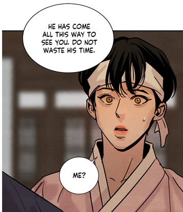 . He is truly rude. We could say that he treats the low-born like a servant, as though he wanted him to feel so little. Kim’s strategy was to remind the painter of his position: he is just a servant, a new version of chapter 52. Remember that Kim’s intention from the start of the second season was always to diminish the artist’s status: he is just a temporally favored servant, nothing more. Striking is that the domestic never says that the lord gave him the order to bring the painter. He uses here a passive sentence “you are to attend to him” which is important. That way, the servant can hide the identity of the person who requested this. And since the lord was looking at the intruder in a rather cold way, I believe that he didn’t expect Baek Na-Kyum.