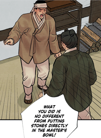 (chapter 66) , he implied with his words that Jihwa played just a prank, since the painter returned alive. Yoon Seungho shouldn’t just get angry, because it was just a joke. As you can observe, all the misdeeds are reduced to a joke. It was, as though they had done nothing wrong. However, the intention is definitely different: the perpetrators intended to hurt the protagonists. And this is not surprising that the chapter 36 contains both pranks: Kim drugged the painter against his will, while the joke from the noble was harmless. And in my opinion, the episode 70 contains both pranks as well. Kim was the one who sent the painter to the aristocrat. Why do I believe this? The reason is quite simple: the servant leading the painter to the bathroom is portrayed with no eye