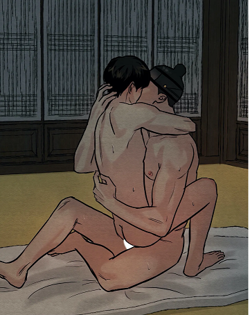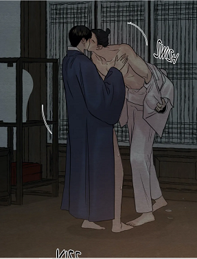 . In other words, Baek Na-Kyum is already dependent on Yoon Seungho. Only him can provoke pleasure in him. In my opinion, the lord’s fear vanishes, because he feels needed. And remember that the lord stood up in order to force the commoner to hug him, so that the commoner would rely on him. As you can detect, reliance plays a huge role in the lord’s liberation. The bed is no longer feared, it has become a place that his lover likes and the latter needs his assistance to feel excitement. That’s why the noble is so relaxed. He knows due to the painter’s words and action that he is now accepted. He even saw and heard his painter’s moans revealing his pleasure.