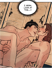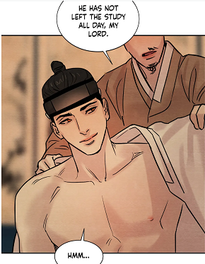 (chapter 34) in order to incite the latter to have sex with the commoner. Imagine, he had just regained consciousness, therefore this trick could have cost the artist’s life. And we shouldn’t forget, the butler witnessed the second sex marathon. He even viewed the flashback from the painter. Therefore in my opinion, the butler is hoping with his “prank” that the lord will act like the previous night. Furthermore, I would like to point out the presence of domestics in chapter 16 and 36. We have Deok-Jae who spied on the couple and manipulated the butler to open the door