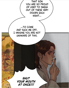 (chapter 62) Here, the noble stated that he adored the painter). This means that the light and warmth had finally reached the lord’s heart, which is also mirrored by the light in the panel. But the problem is that after the low-born’s disappearance, the master had the impression, he had been betrayed and abandoned. Hence he became enraged and blinded by his own wound. This is a sign that he definitely took it to heart. Moreover, we shouldn’t forget that despite the incident at the barn, the noble was not even able to stick to the rule, treating the artist like a sex toy. In the end, Yoon Seungho brought him to his own bed, indicating that he considered him as his partner. To sum up, the noble was still not honest to himself exposing the valet’s influence.