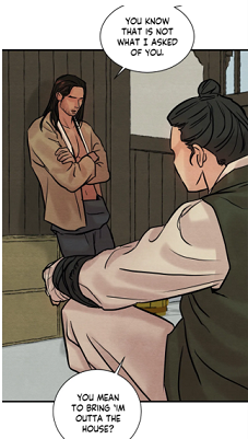 (chapter 69) There’s no doubt that Yoon Seungho never gave such an order. He was already too happy that the painter had chosen to stay by his side. Besides, note what the domestic says: “He will have you killed”. In other words, he will give the order to eliminate the kisaeng. Yet we know for sure that Yoon Seungho killed the servant with his own hand. Therefore it displays that Kim was the one speaking behind this. This exposes that the butler considers the mansion as his propriety. Hence I come to the conclusion that Kim didn’t choose to follow his master out of loyalty for him, but because he had become comfortable in that mansion. But he had definitely other reasons, like for example following the eldest master’s order (on the surface).
