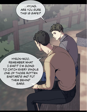 (chapter 24) The villainess and her pawn are standing, while the brothers are sitting. This is relevant, for it indicates that the detective and his Kang Hyeon-Woo are resting. By confiding to his brother, the future victim is taking a break, trying to release his stress and getting some comfort and support from his relative. On the other hand, the couple is standing indicating a certain tension. They are attempting to relax, but they can’t due to the pressure. They are about to start their project.