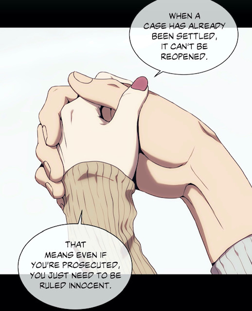 (chapter 24) Her so-called comforting words truly display that only Do Seong-Rok is getting his life in danger, as he will be the only one prosecuted. This means, the serial killer will divert the attention of the investigation and the prosecution office from Jeon Hee-Seong. The woman’s gentle gesture is actually masking the high expectation she has from her “lover”.