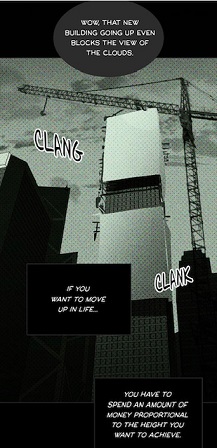 (chapter 11) Observe that this panel lets transpire the director Oh’s cupidity and selfishness. It was, if the money was alive looking at the man’s face, as the bag opening has the form of the eye. In addition, green is often associated to the snake, which symbolizes temptation and sin. This single image reflects the darkness of this world. Money is ruling this country and city. Therefore it is not surprising that the story begins with this picture.