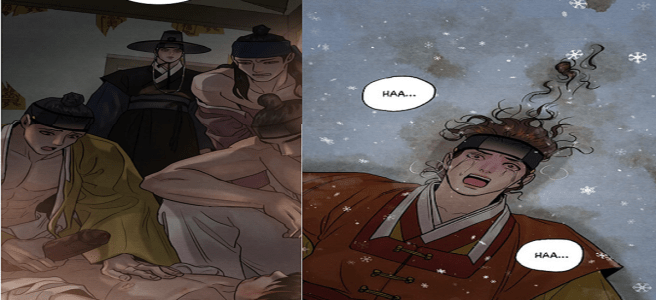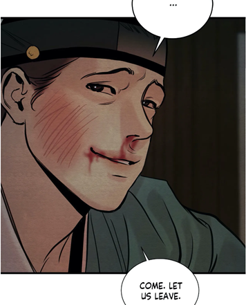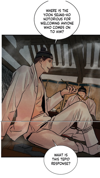 (chapter 52) Here, he was simply following social norms and as such behaving like Lee Jihwa. This reveals that the main lead had no faith and as such no true conviction. As a good host, he is supposed to provide his guests with the best care and attention. Since Min was expressing his wish to taste the painter, the noble was pressured to give in. The manhwaphiles can now detect the parallels between chapter 52 and 100.