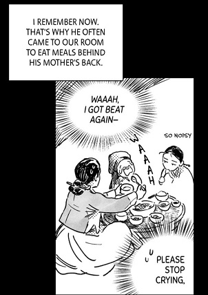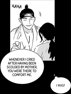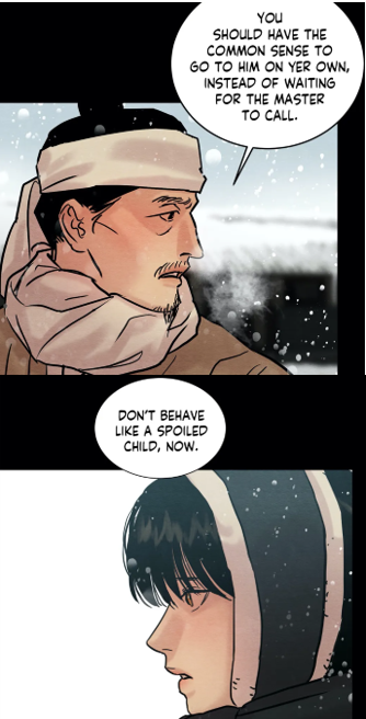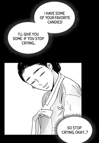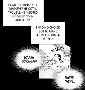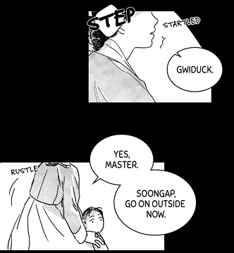 (chapter 6) The young master felt loved there. However, if the manhwaphiles compare the last two panels, they can detect a huge gap again. Pilgyeon never realized that Soongap and his mother never truly comforted him. They just accepted his presence. The third son never comprehended that they allowed him to do anything in their family, for the simple reason that he was a noble, the younger master of the mansion. As slaves, neither Gwiduck nor Soongap could ever refuse anything.