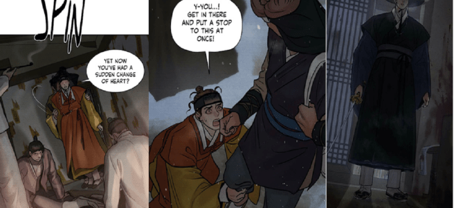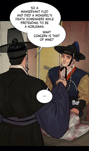 (chapter 3) However, after so many years of separation, the gap between them could only increase. For the main lead, Pilgyeon was now a lord and no longer a part of his family. Only after their reunion, Pilgyeon was confronted with the truth. Their social status made it impossible to act like in the past. Hence the protagonist acted, as if he was not his brother. From that moment, Soongap made sure to keep his distance, and even rejected any offer coming from Pilgyeon. He had every reason to do so. After his mother’s death, Soongap had been sent away to the main house of Jeon.
