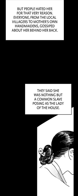 (chapter 6) The father was deeply in love with Gwiduck, thus he treasured her very much. He would give her jewels and good clothes. However, since Gwiduck was just a slave, the father decided to remarry after the death of his first wife. The former had two reasons for this. First, according to social norms, his household needed an official wife. Moreover, I am suspecting that the father must have been pressured by his own family as well. Soongap’s father is actually a younger master, so his elder brother, and as such the head of the household Jeon, had a right to meddle in the life of the main lead’s father. I could use the following panel as an evidence that the family’s attitude had a great influence on the father.