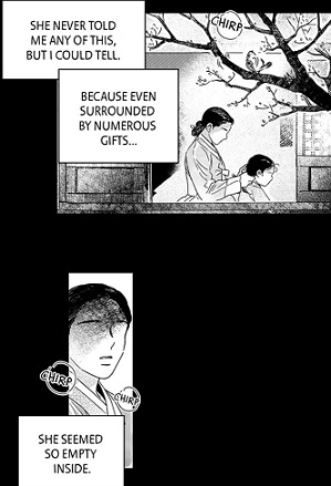 (Bongchon bride chapter 6) She just treated him as a master using his right. The title displays the absence of intimacy. She was not seeking his presence, it was always the father who would visit her room. As a conclusion, she was just a favored servant and nothing more. However, the father never realized his concubine’s unhappiness. He imagined that by acting as a generous man, he had showed to her that he loved her. I doubt that the man ever confessed to her. Why should he? In his mind, it was clear that he cared for her very much. Besides, we have to question ourselves if a noble would ever confess his love towards a slave. This would be beneath his dignity, just like no noble will ever apologize to a commoner.