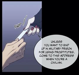 What caught my attention is that as a soldier, he got abandoned by his comrades too. (Chapter 16) He was also left behind, and contrary to the past, this time he was saved by Jeon Hee-Seong. (Chapter 16) She protected him from committing a wrongdoing. She talked to him, and showed an interest in him. (Chapter 16) She even gave him her address to contact her after he had left the army. (Chapter 16) This panel even stands in opposition to this one: (chapter 27) As the manhwalovers can sense, the femme fatale behaved the exact opposite of the father. She didn‘t push the main lead away at all. She even recognized him after the separation, so he had left an impression on her. Thus we could say that she gave a meaning to the protagonist‘s life. She even paid an expensive hotel for their encounter. He felt recognized first, then appreciated before feeling needed. Therefore it is not surprising that Do Seong-Rok desired to protect her, (chapter 16) and was even willing to risk his life for her. (Chapter 16) He was by her side in the street, and he didn’t mind being seen with her. She only pushed him away, when she was cornered implying that she had no other choice. She had to marry Choi Yeong-Gil if she wanted to escape prostitution. In other words, we could say that she never rejected the main lead. She insinuated that he was her source of joy in her life. (chapter 16) So technically, she announced that she was leaving him officially, but not emotionally. That way she pushed the main lead to remain by her side, while giving the impression that she was leaving him behind against her own will. She had no other choice. Striking is that in that scene, the prostitute spoke the truth, when she portrayed herself as ruthless. Her justification was that she was a poor victim. (Chapter 16) She would do anything to save herself, even use him for her own benefits. The latter didn’t mind, for in his eyes, he was helping himself. (chapter 16) She was still giving a meaning to his life. He would act like a knight in shining armor who needed to defeat his enemies. (chapter 16) However, when she suggested the murder, the main lead put a condition on his assistance. (Chapter 06) But striking is when the main lead asked her this, he never requested from her that she signed a paper or a contract. This promise was just oral. This was related to his trauma: the left note with the fake promise.