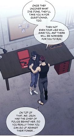 In my opinion, her intention was to let Seo Sang-Joon and Do Seong-Rok to take the fall. That way, she would be left out of the equation. The two men had worked together. That’s the reason why she asked her future husband Ahn to manipulate the file. (chapter 36) What she doesn’t know is that a promise was the cause for the destruction of her plan. How so? (chapter 31) If Seo Sang-Joon had not made a move on Lee Je-Oh and caused trouble, the prostitute would have never seen this scene: (chapter 31) The convict was scared of jail! He was really distressed in front of Lee Je-Oh. (chapter 31) The prostitute is well aware that this man just needed to get scared and cornered, then he will commit suicide. As you can see, the femme fatale’s promises are all linked to illusion and downfall, while the dark-haired man embodies reality and real promises.