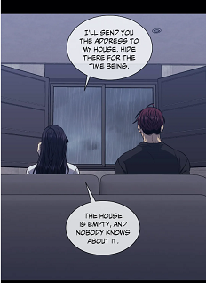 Striking is that after having sex with him, she never faced the young man. She turned her back on him, a sign that she was not honest at all. Her facial expressions would have betrayed her, while her words would reflect her true thoughts. (Chapter 16) Her words in the bed were actually ambiguous: a reproach or a compliment? That‘s the reason why the protagonist couldn‘t detect her deceptive nature. She was speaking the truth the entire time. And after meeting Lee Je-Oh, the red-haired man was forced to face reality. Hence his past with the woman came to haunt him. Gradually, his unconscious forced him to see the reality of his choices and actions. He had been manipulated and become a killer. In his first nightmare, the woman was portrayed without eyes (chapter 6) while revealing her intentions. (Chapter 6) Then when Sang-Joon called the femme fatale, she might have been sitting next to him (chapter 40), but observe the gap between them. She was still not facing him. Besides, I would like the readers to pay attention to the window in the background. The frame symbolized their separation. They were not really together, as there existed a thin wall between them. Moreover, the prostitute was even talking to the convict, so in reality she was not focusing on Do Seong-Rok. Therefore, it is not surprising that Do Seong-Rok saw the truth on the sofa, while he was facing her. (chapter 27) He was forced to face reality, she was only feeling compassion for him. When she visited him in the mansion, he looked at her properly for the first time: (chapter 27) She had the same facial expressions than his father. She was abandoning him. This is no coincidence that right after he questioned her about the depth of her affection. (chapter 27) He was testing her. He could detect her deception, for she never replied to his interrogation. (chapter 27) She attempted to divert his attention by criticizing him, something which sounded so natural. And her departure (chapter 27) reminded him of his own father’s desertion. As a conclusion, after rescuing Lee Je-Oh, the main lead discovered his lover‘s true personality. She wouldn‘t keep her promise, for she had never loved him. He realized that her promises were always fake, just like her insurance. The former prostitute had never committed herself to him, she had never been by his side, while he had helped her this entire time.