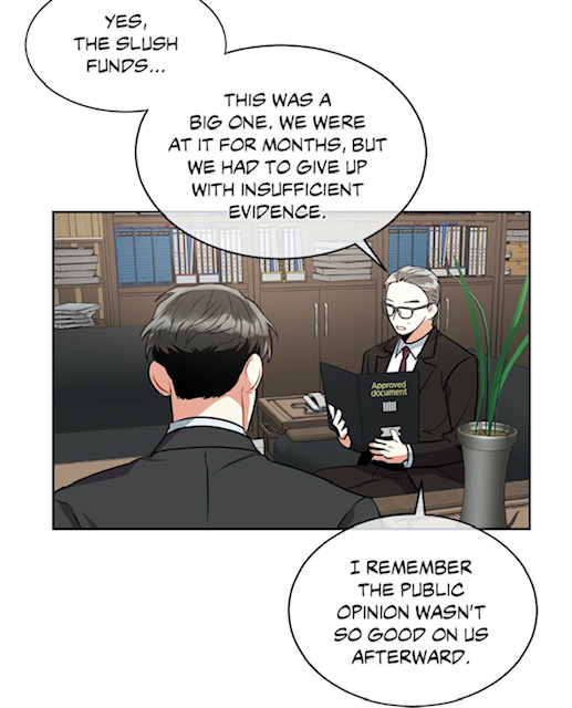 (chapter 39) Note that in the beginning, Gu Sehuyk was supposed to investigate the slush fund. Yet due to his brother’s death, he was removed from the case, for he was left traumatized. His colleague Na Joohwan took over the case and look how it ended: