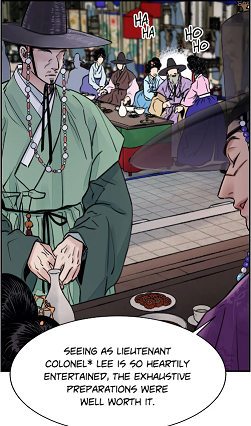 (chapter 3) Here, he was complimenting the headman Choi, though he had already perceived his wrongdoings and motivations. Yet, he was still giving the impression that he was in a good mood. Then