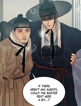 (chapter 50) Here, the butler had tattled on the painter so that the noble would distance himself from his sex partner. And in episode 104, we have a similar situation: through suggestions, the main lead was encouraged to send back the painter to the kisaeng house. Secondly, why would the lord think of the butler, when he saw the sacred tree?