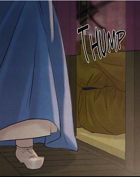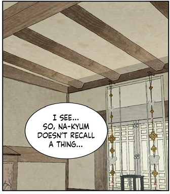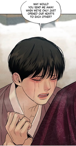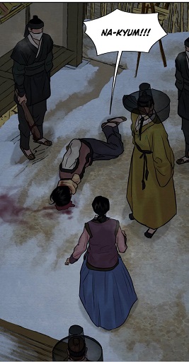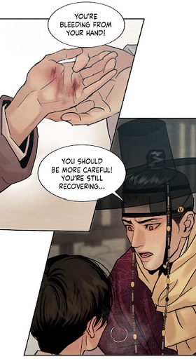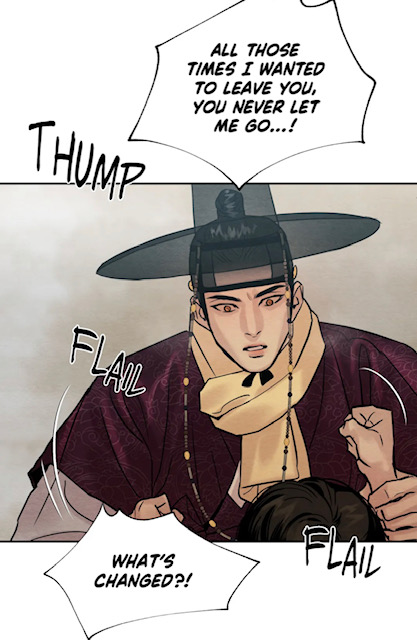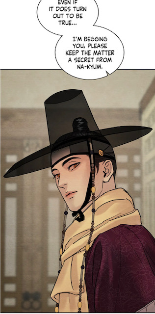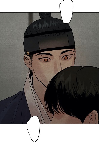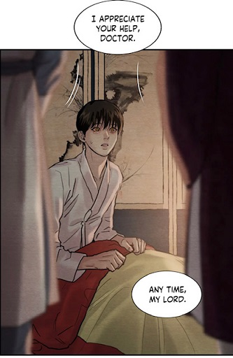 (chapter 107) So he gave the impression that he was listening to the painter. However, the reality was that at the end, he still listened to the doctor thinking that it was for the painter’s best interest. Since Baek Na-Kyum was traumatized from the sexual assault, the main lead thought that he was hiding his illness or he was in denial. What caught my attention is that Yoon Seungho followed the doctor leaving the artist in the bedchamber alone. On the one hand, this could be perceived as a prison, yet I judge his gesture as the opposite. It is to protect Baek Na-Kyum! In Yoon Seungho’s mind, behind the closed door, his lover won’t see or hear what is happening in the courtyard. He will be protected from cruel reality.