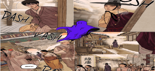 (chapter 106) How could he abandon his lover like that? For some readers, he acted like a fool. Nevertheless, his reaction was normal, because the man with the purple hanbok represents the cause for Yoon Seungho’s martyrdom. This means that the ghost with the purple hanbok symbolizes danger for the protagonist. And if he gets targeted, his lover will suffer too. Striking is that during the same day and night, there is another person wearing a purple hanbok: Yoon Seungho!