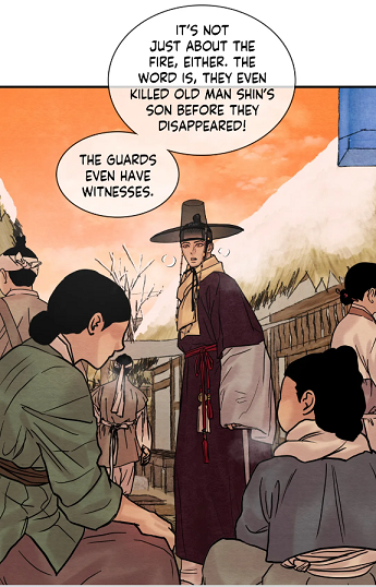 (chapter 104) The anonymous tattler has been actually deforming the reality which Yoon Seungho had accepted as such back then!! But due to the grapevines, the lord noticed that he had been misinformed. There were differences between the declaration of the anonymous witness and the gossips which forced him to return to the scene of the crime. Because the tree was still standing, the lord recognized that he had been deceived: not only the tree was intact, but also the house despite the traces of a fire. That’s the reason why he looked in the direction of the building.