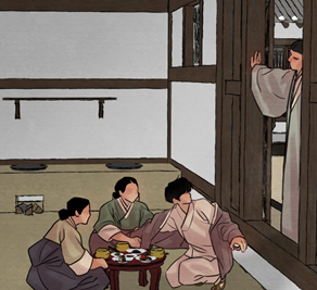 Striking is that heavenly can be employed in a different context food. Let’s not forget that food is often served as offering to gods and spirits. Interesting is that in Asian societies, it is a tradition to offer the favorite dishes on the anniversary of the relatives’ death. As you can imagine, this custom was already practiced in Joseon. And now, take a closer look at this scene.