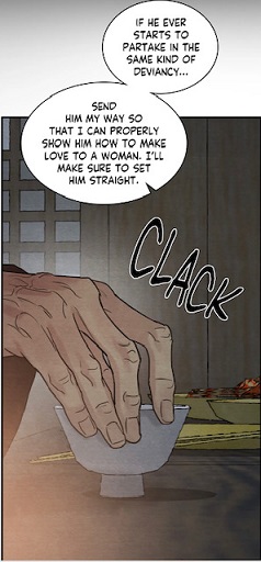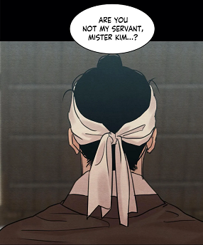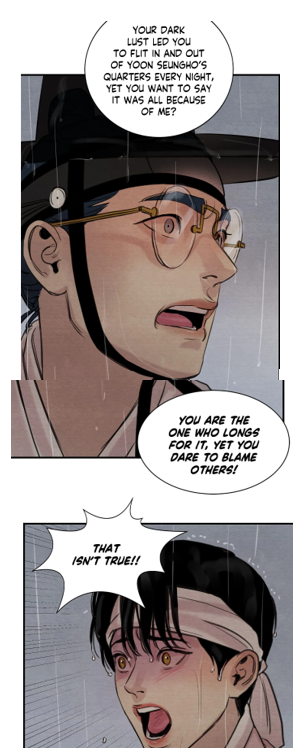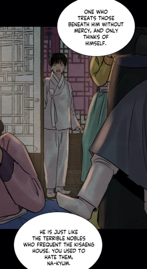 (chapter 119), therefore he believes that the artist is tied to the mansion. Secondly, I am quite certain that his perception about the artist is influenced by Kim. This signifies that the latter is also projecting his own thoughts onto the painter, for he is himself a narcissist. The latter is interested in wealth and comfort. If he came to lose everything, he would abandon Yoon Seungho, that’s what Kim is envisaging. Thus if Yoon Seungho were to submit himself to the father, Baek Na-Kyum would lose everything. Besides, I am even thinking that Jung In-Hun’s approach in the gibang is also related to the brother and the butler. All of them had an interest to separate the couple! And note that when the lord went to the noonas’ room, it looked like the painter had deserted him.