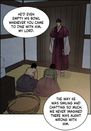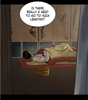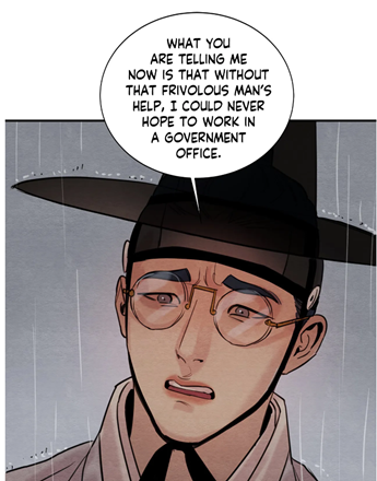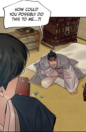 (chapter 116) However, observe that in episode 116, Yoon Seungho had witnessed how his lover had taken care of him, while he was unconscious. Furthermore, the petition had been handed over to the painter and not Kim, a sign that the artist had become the protagonist‘s confident. As you can see, as time passed on, the main protagonist learned the following lessons: he should stop relying on servants, he should only trust his partner. I would even add that he was taught the following principle: “If you want something done right, you have to do it yourself”. In my eyes,