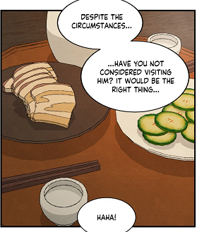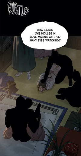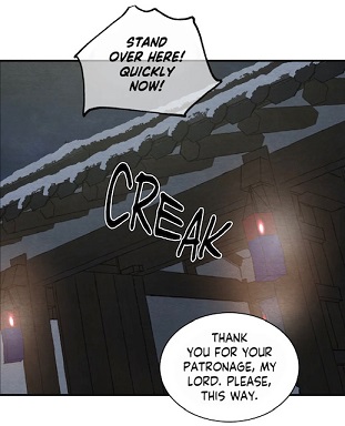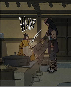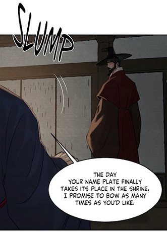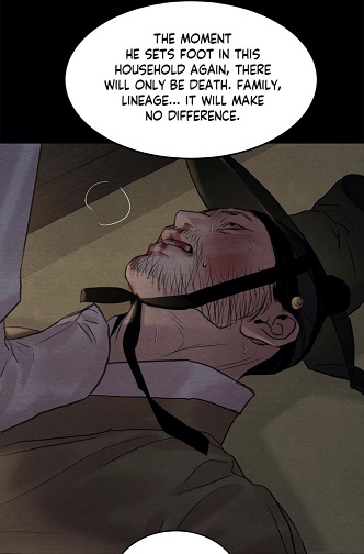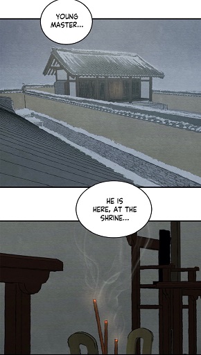 (Chapter 85) The absence of his sons and of food as offerings reveals that he was not showing true respect to his ancestors. He used religion and social norms to hide his true intentions. He wanted to take over the mansion. Hence the black guards were standing at the entrance of the sacred house. Their presence symbolizes violence. Therefore it is not surprising that the gods chose to punish the elder master through Yoon Seungho. The former was not received properly