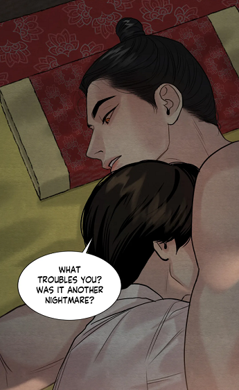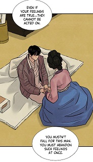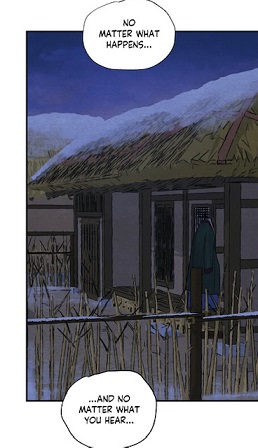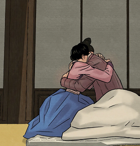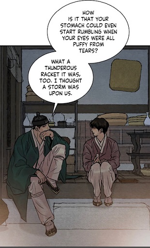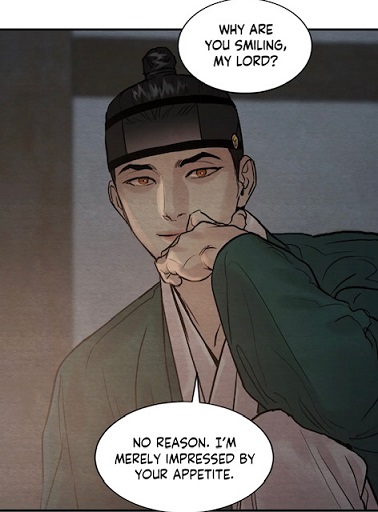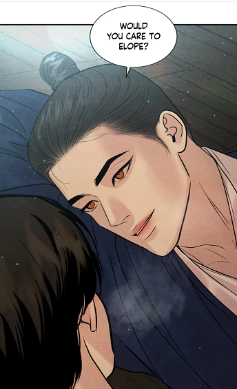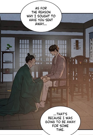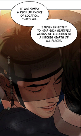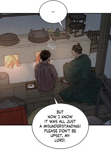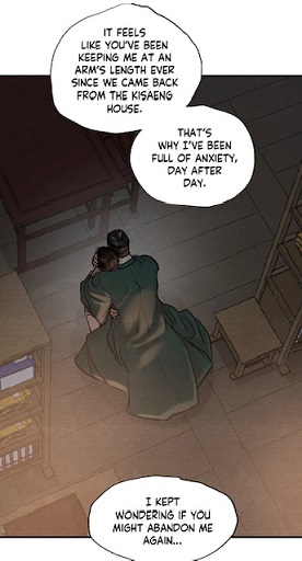 (chapter 102) In episode 102, he was renouncing on everything (life, mansion, wealth and connection), because he imagined that the artist had died. Consequently, I deduce that in episode 119, the painter’s life is attached to the lord’s for good. If the artist got into trouble, Yoon Seungho would side with him and the reverse. Thereby, I come to the conclusion that this moment in the kitchen represents their union, as they are no longer tied to the mansion. They are now a family no matter where they are. Let’s not forget that the painter expressed his wish to run away with his lover.