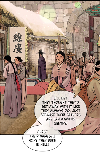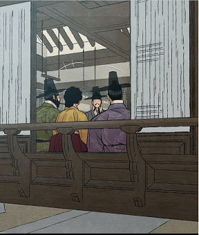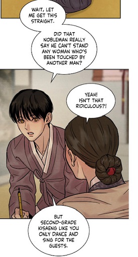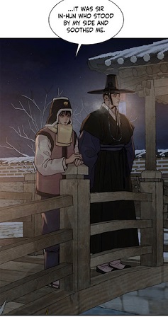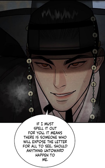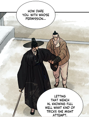 (chapter 107) stated that he was no longer an official, we could exclude him as a suspect, unless he is lying. For me, he is not telling the truth. Honestly, he is wearing a purple hanbok which is actually reserved to people close to the royal family. Moreover, the hanbok has a design indicating that he is not poor, living in seclusion. Besides, let’s not forget the comment from the kisaeng welcoming him. He hadn’t come to the gibang for a while.