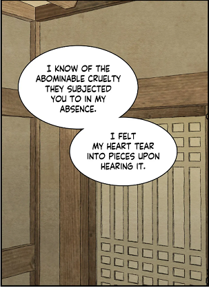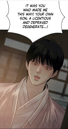 Under this new light, it becomes comprehensible why the father could only reject the offer from lord Song in the gibang. Doubting Yoon Seungwon’s sexuality meant to question about the father’s sexual orientation. At the same time, it is not surprising why the elder master would blame Yoon Seungho for everything, for he couldn’t admit his responsibility for the purge. Consequently, the Manhwaphiles can grasp why Yoon Chang-Hyeon came alone to the shrine. If he had brought Yoon Seungwon, the father would have been reminded of the elder son, as both can not be separated. This explicates why the younger master asked his elder brother to submit to his father.
