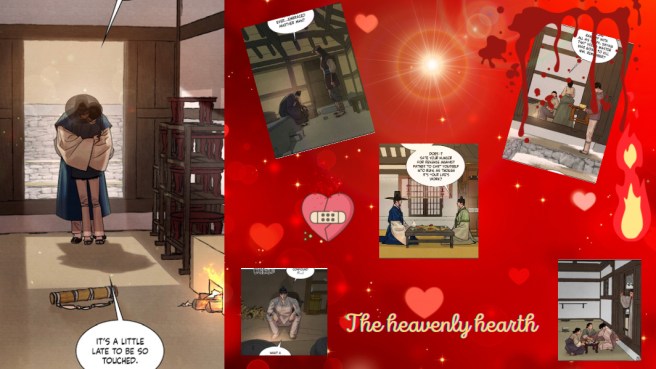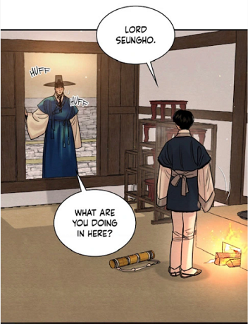 (Chapter 119) Why? It is because he burned a paper. The evidence for this is the presence of the painter’s belongings. This is the place where he used to hide the scholar’s poem (chapter 4). Moreover, the painter is standing in front of the hearth which certainly triggered the manhwaphiles’s memory. Jung In-Hun was seen in front of the hearth burning the letter from Min in order to hide his involvement in the painter’s sexual abuse.