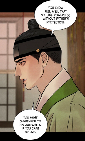 (chapter 107) If the king executed his own son, the patriarch Yoon Chang-Hyeon could do the same. It was actually justifying the violation of Confucianism. For me, this topic was brought up, because a father had been put in the very same situation! He had to sacrifice his own son. And note what the gossiping woman criticized on the street: