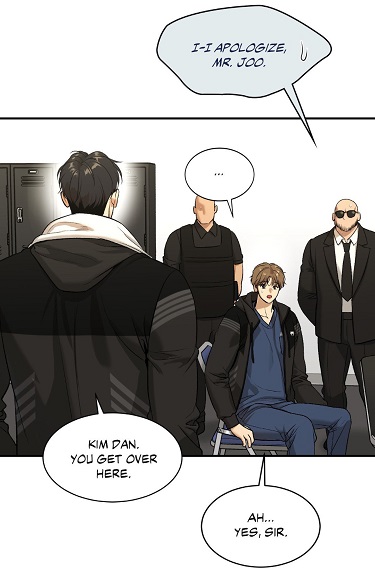 What caught my attention is the similarity between this image (chapter 40) and this one: (chapter 11) Yes, the MFC security guys are mirroring Heo Manwook and his minions. And not just once, but twice!! (chapter 16) Their position is not only very much alike, their behavior is the same. They use coercion and force in order to break the protagonist’s will. Both characters “kidnapped” the main lead. They are using an isolated place and the number of minions in order to pressure Kim Dan to admit his wrongdoings. Each time, the thugs threatened to go after the halmoni (chapter 11) and (chapter 16). In the interrogation room, the MFC security agents accuse him to have plotted against the celebrity. (chapter 40). As you can see, Joo Jaekyung is utilized the same way than the grandmother. Moreover, I would like to outline that in episode 16, the main lead got kidnapped in broad daylight, and no one stopped them. (chapter 16) And the same happened in the arena. (chapter 40) Though the stadium was plunged in the darkness, the Manhwa lovers shouldn’t forget that the match took place at 11.00 am. So it should have ended around lunchtime. To conclude, the kidnapping and sequestration from the security agents is a combination of episode 11 and 16, therefore we have the same elements: blue and black reminding us of the night and the time as an indicator for the day. But let’s return our attention to the physical therapist in the arena. He was approached from behind, for the mysterious man touched him by the shoulder. (chapter 40) Secondly, the moment doc Dan turned his head, he could see two people. (chapter 40) By the way, these two unknown men were not wearing sun glasses in order to avoid raising suspicions and mistrust. This explicates why the gentle doctor followed them without protest. He trusted them. The most surprising is that though the latter was approached by 2 men, Potato didn’t intervene. (chapter 40) Even, when Park Namwook is informed that the security took away the physical therapist, he showed no concern. For him, it was legal and normal due to the dubious nutrition shake. The Jinx-philes can sense the same passivity from people in Seoul and in the States. Why did no one from Team Black feel the need to follow the physical therapist? In my opinion, it is related not only to their blind trust, but also to a certain indifference. Kim Dan has a special status at the gym. Technically, he is just the private physical therapist from Joo Jaekyung.