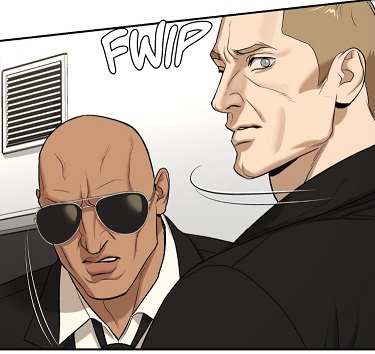 Finally, both Heo Manwook and the MFC security agents believe to have the right to act that way. In the first case, the main lead had to pay off his debts. (chapter 11), hence he was not allowed to move away. He was even forced to expose his private life to them: his job, his home, his family. It was, as if they were entitled to know everything about him and give their consent about each action. This explains why the loan shark thought, he was allowed to abuse Kim Dan physically. (chapter 11) or even trespass his house and rape him. (chapter 16) Striking is that MFC has a similar attitude in the end. They control their stars’ life through their regulations: the weight categories and weight cutting . (chapter 37), they supervise their food (chapter 37), and finally they take blood samples or urine tests in order to ensure that the fighters didn’t use any drug. (chapter 29) This explicates why the man with black glasses asked him about his relationship with the physical therapist. (chapter 40) It was, as if they had a right to know about his entourage. Joo Jaekyung had no right to have a private life. It was, as if the champion had to justify Kim Dan’s presence and indirectly why he had hired him. The reality is that they were trying to spy on him, dig up more information. Under this new light, it becomes comprehensible why the thugs questioned Kim Dan like the MFC security agents. The moneylender desired to know the origins of his income. (chapter 11) Funny is that Heo Manwook suspected the main lead to earn his money through illegal means, while in reality, the former is actually the one using illegal means. As you already know, for me, he is involved in the set up against the two protagonists. But it doesn’t end here. MFC guys are acting like legal authorities, thus they are wearing black suits and glasses (chapter 40) reminding us of FBI agents.