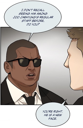 The most infuriating is that they tried to act like “saviors”, when the champion entered the room. (chapter 40) Like Joo Jaekyung pointed out, this trick was exposing their lack of security. They had failed their duty. (chapter 40) (chapter 40) They backed off, but note that the “fake investigator” still asked the star about his special relationship with the target: (chapter 40) It exposes that someone desired to know more about the private life of the star. The man with sun glasses was tasked to dig up information in the end. In other words, the persons involved in the conspiracy is increasing. The MFC security agents are no longer innocent. But I doubt that they will investigate the matter any further. In my eyes, they will try to sweep the incident under the rug.