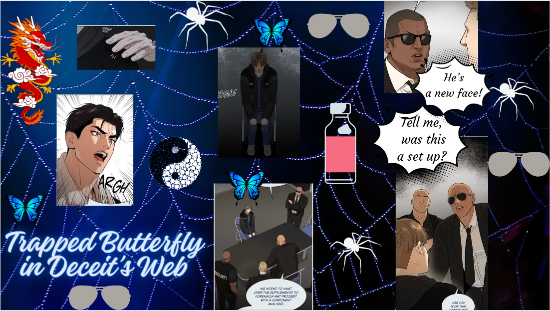 In episode 40, the Manhwaphiles assist to the return of the doctor’s faith and hope. (chapter 40) This signifies that in this moment, Kim Dan decides to cross the line, especially since he likes the emperor. He is accepting that he means much more to Joo Jaekyung than being his toy. Because the champion called him “his person”, he felt moved and indebted. Consequently he started considering himself not only as being a part of the champion’s life, but also as a part of Team Black. (chapter 40) Don’t forget that the athlete is the face of the gym. Thus the gym put a huge poster of the athlete outside. (chapter 1) The reference of belief in two panels from episode 40(chapter 40) led me to associate Kim Dan with a butterfly, for the latter symbolizes faith, hope, change and rebirth. And now, you comprehend why this illustration contains blue-black butterflies. They are alluding to the physical therapist. The latter is wearing his blue uniform with the black jacket from Team Black. (chapter 40) And the butterfly got unfortunately caught by a spider. (chapter 409. Yes, the hand from the MFC security guard reminded me of a spider. But there exists another reason why I came to connect the MFC security guys with the spider. It is because both are related to the web. There is no doubt that the MFC security guards wove a web of lies to Kim Dan. And how can we detect this? There exist different methods to expose the men in Black as manipulators and hunters. First, the MFC security guys are wearing glasses. Another method is to compare the interrogation scene with episodes from Jinx. Finally, it is important to examine their words and as such their speech bubbles. But let’s start with the glasses.
