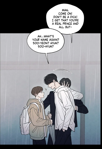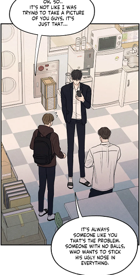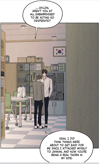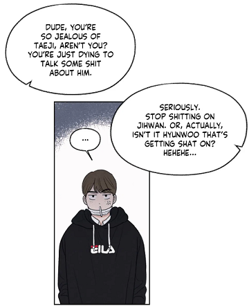 When this character was first introduced in the story, it becomes clear that there exists a secret between him and Soo-Young. (chapter 2) But the readers are left in the dark about the nature of their past relationship. It was, as if Soo-Young had been a victim of bullying and was coerced to live as an outcast. This panel illustrates his isolation perfectly. (chapter 2) However, the moment Guyjin witnesses the exchange of greetings between the two main leads (chapter 2), he stayed outside the classroom. Their brief interaction had caught Gyujin by surprise. He was left paralyzed. He.feels frightened, for he has the impression that Soo-Young could escape from his control. This explicates why later he approaches Soo-Young again (chapter 2) and portrays Soo-Young to Jihwan in a very bad light. (chapter 2) He desires to separate them. What caught my attention is that his words are actually reflecting his own personality. Gyujin has a good reputation among his peers, but his interaction with Soo-Young exposes that he can not be judged by his cover. This person is very manipulative, and not just with Soo-Young, but also with other school mates, like for example with Hyunwoo. The latter is envious of rich people, especially of Tae Jihwan. (chapter 1) Yet he was staying close to the main lead, for he could benefit from this relationship. The girls would approach him, for he was Jihwan’s friend and he got the opportunity to party without spending any money. However, the moment Gyujin noticed that the two protagonists got closer, he chose to use Hyunwoo as his pawn. On purpose, he criticized Hyunwoo in public by siding with Tae Jihwan (chapter 14) so that the latter would feel upset and betrayed by Tae Jihwan. (chapter 14) (chapter 14) By confronting him with the truth, he earned Hyunwoo’s trust. Gyujin utilized Hyunwoo’s resent towards Tae Jihwan to blackmail Soo-Young again. (chapter 21) Hyunwoo became his spy and that’s how he got the picture with the kiss. (chapter 20) Yes… this little monster is exactly like his mentor Gyujin, a hypocrite hiding behind social norms. Thus Hyunwoo condemns homosexuality. (chapter 21) and his mentor doesn’t object to this statement.