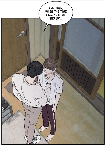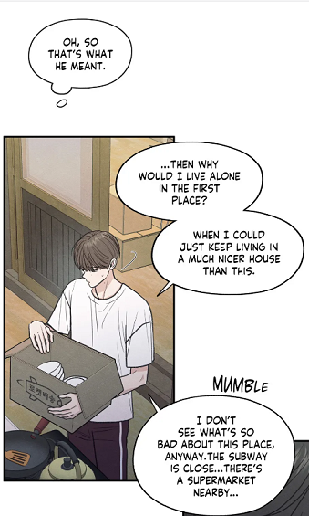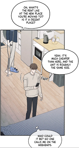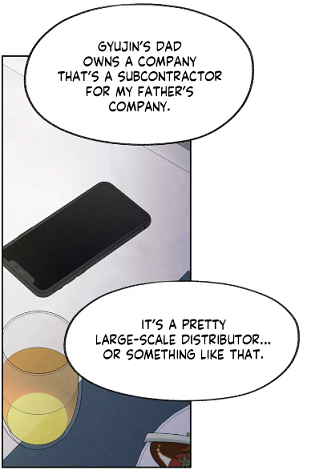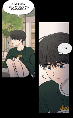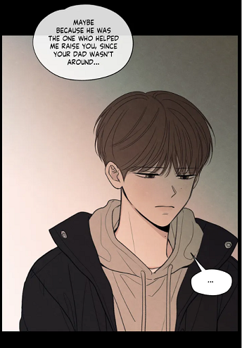Since he was raised by his mother, it implies that he doesn’t know his father. (chapter 2) So we could say that he was abandoned by him. Interesting is that Soo-Young’s mother received the support from her brother, the so-called uncle. (chapter 2) However, I started doubting this fact for two reasons. First, I would like to point out that Soo-Young has never met his uncle since the beginning of the story. In fact, the latter informs the main lead through the mother (chapter 2) (chapter 18) or through the cell phone. (chapter 27) (chapter 23) There is no direct interaction between them. Moreover, observe that there is no picture of this relative. It was, as if he was a ghost. Additionally, the mother even asked her son to limit their communication. (chapter 18) Finally, Soo-Young stated that the uncle provided money to the mother (chapter 2), yet he never raised the nephew personally. He only shows concerns for his school career. Finally, the uncle doesn’t seem to have a family on his own. There is no wife or daughter. Yes, this character is really mysterious and ambiguous. Consequently, it dawned on me that Soo-Young could be an illegitimate son and the faceless “uncle” would be in reality his father. This would signify that the latter could never claim the main lead as his own son, for the mother was just a mistress. Another possibility is that the uncle is simply the “mother’s companion” and the boy is from a past relationship. Moreover, the fact that the “uncle” is slowly pushing away Soo-Young out of the house (chapter 2), asking him to live in a cheaper flat is really suspicious. The official reason is that he has become sick. (chapter 18) It was, as if he wanted to get rid of the boy… he was the burden. Thus I can’t help shaking the feeling that there is an ulterior motive behind the uncle’s generosity. Moreover, when Soo-Young was moving in his new apartment, none of the relatives were present. Only Tae Jihwan assisted him. The uncle faked his “support” by calling him. (chapter 27) Interesting that after listening to their conversation, Tae Jihwan asked him this: . (chapter 27) He utilized the idiom “parents”, because he thought that Soo-Young had been talking to his father. He had not paid attention to the name “uncle”. As you can see, “the uncle” is really suspicious. For me, he has always been the mother’s companion, but he hid his true identity by the title “uncle”.